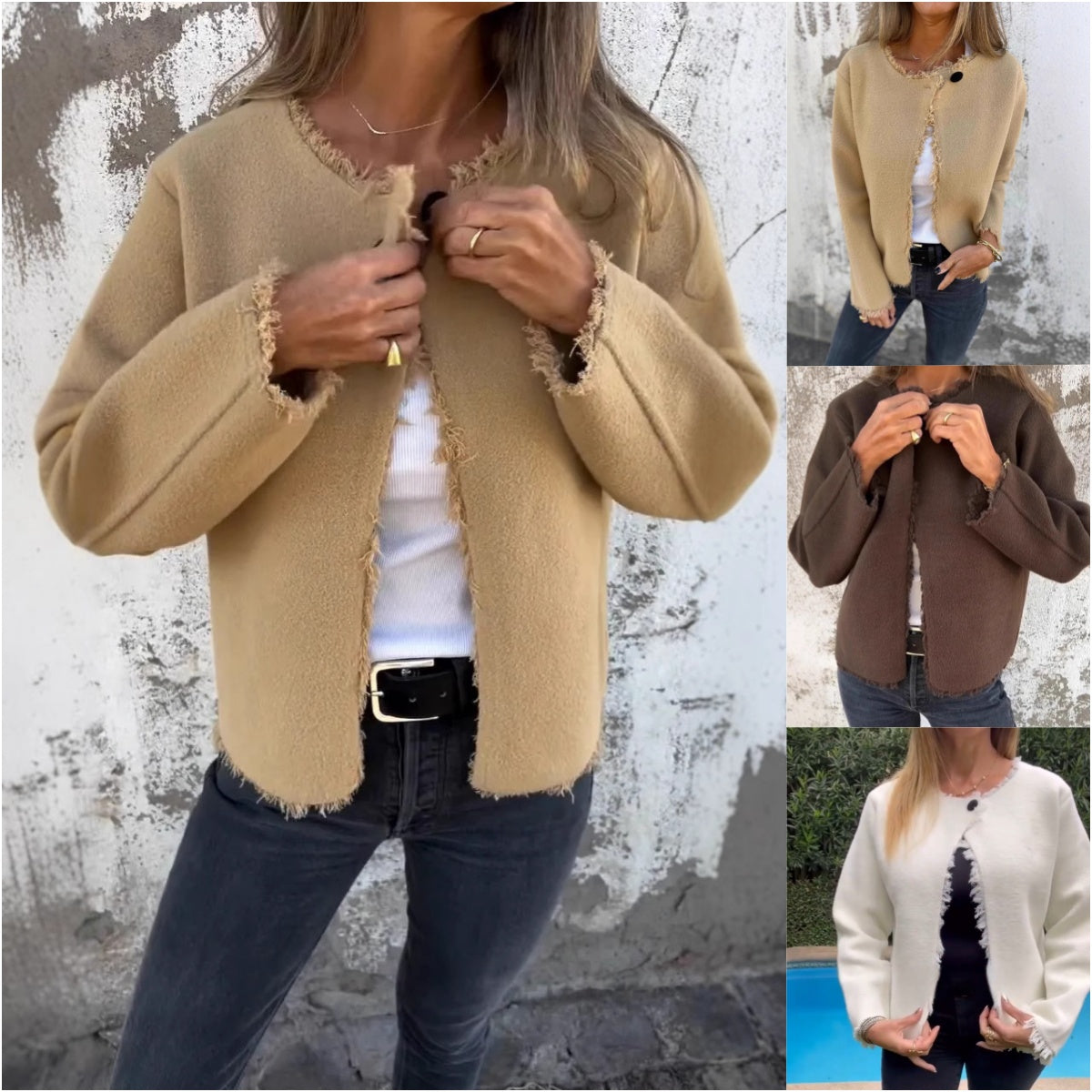 DEKORATIVNÍ ROZTRŽENÉ OKRAJE PRO TRENDOVÝ VZHLED: Tato bunda je navržena s roztřepenými okraji na manžetách, výstřihu a zapínání, což jí dodává elegantní texturovaný detail, který podtrhuje její ležérní, ale stylový vzhled pro každou příležitost.