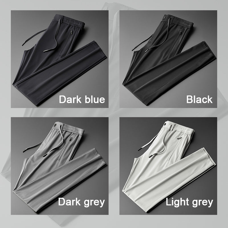 Pánské ledové hedvábné sportovní volnočasové kalhoty jsou vyrobeny z příjemné tkaniny. Textura ledového hedvábí je chladivá a prodyšná, takže je vhodná na léto. Pohodlně se nosí, nesnadno se vyhrnuje a nemačká a barva nevybledne. Je to ideální volba pro muže v létě.
