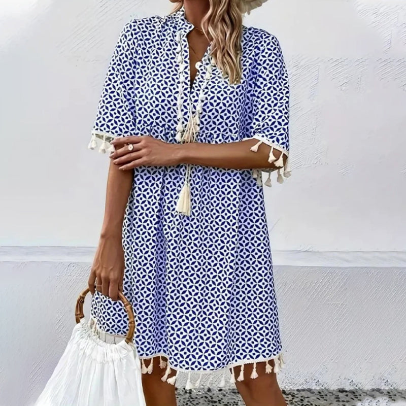 Zestaw zawiera: 1 × Damska casualowa sukienka boho z nadrukiem, dekoltem w serek i frędzlami