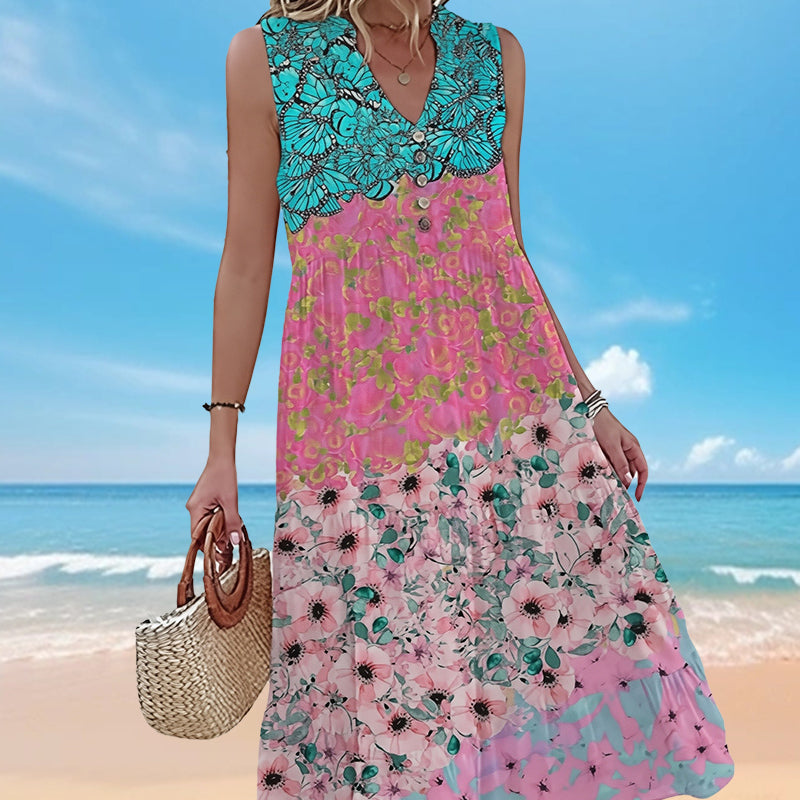 1 x Dámské elegantní bezrukávové šaty s květinovým potiskem a V-výstřihem