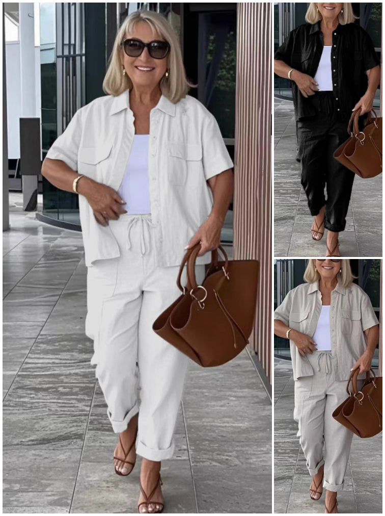 Sada obsahuje 1 x bavlněné a lněné tričko s krátkým rukávem a volné kalhoty