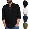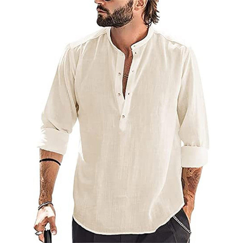 【FUNKCE】Pánská plátěná košile pro volný čas, má stojáček, jednobarevný střih, úzký střih, dlouhý rukáv (Roll-up), zapínání na knoflíky.