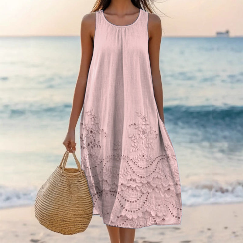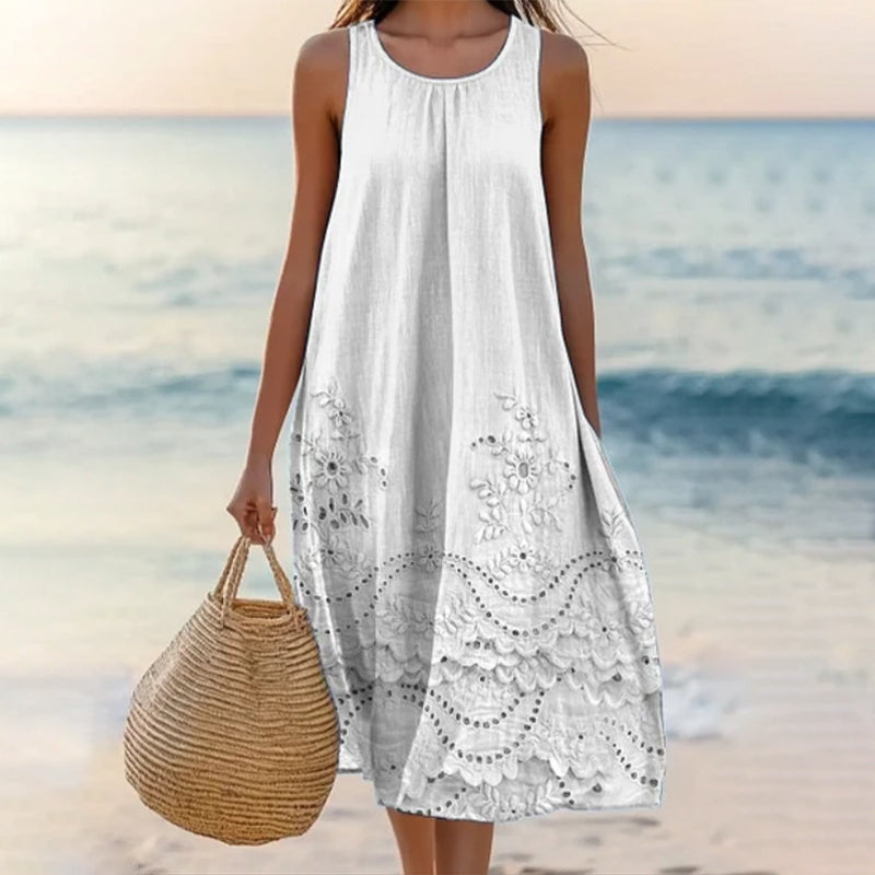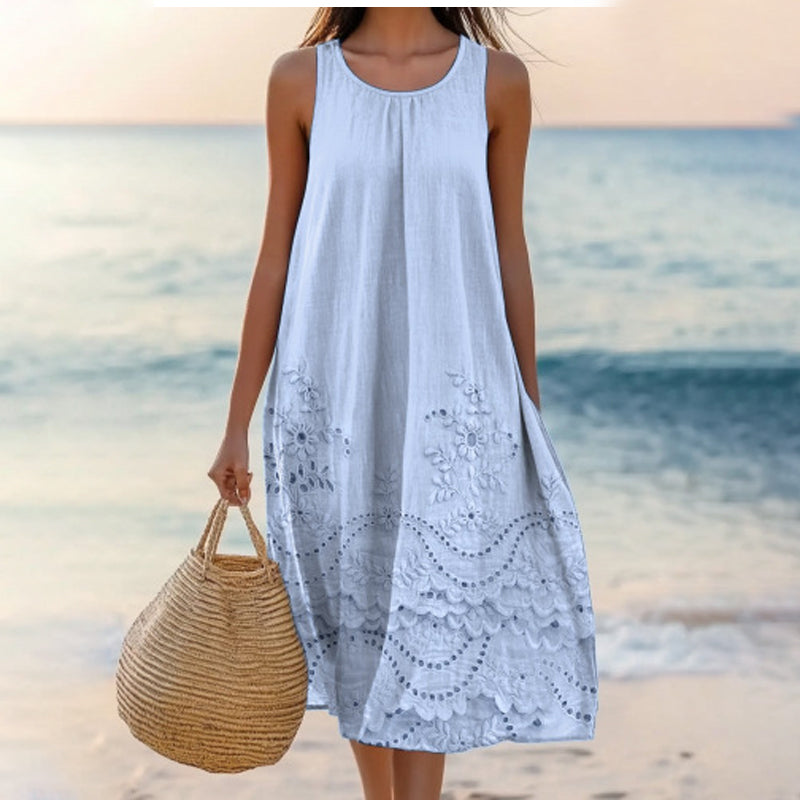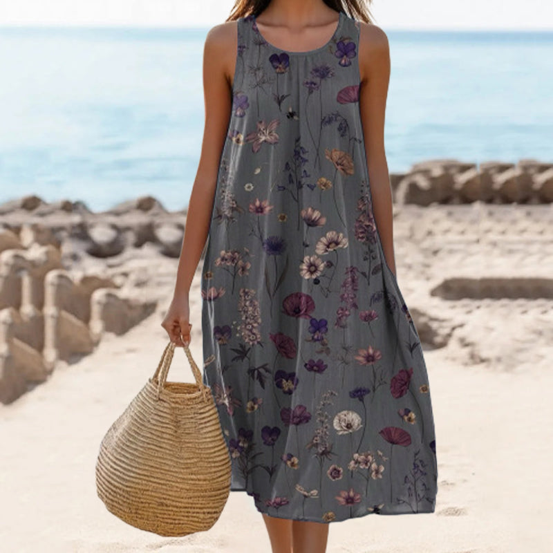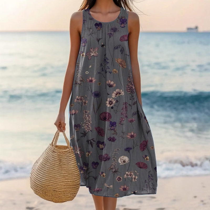 UVOLNĚNÁ A SPLÝVAVÁ SILUETA - Má volnou, splývavou siluetu, která vyhovuje různým tvarům postavy. Kulatý výstřih a délka nad kolena vytvářejí vyvážený a stylový vzhled bez námahy.